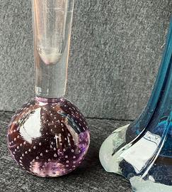 4 vasetti da fiore in vetro , il primo da sx ha la base sfumata di viola con micro bolle al suo interno resto trasparente, il secondo è azzurro con base trasparente, il terzo ha la base azzurra stelo blu e la bocca finale ocra molto forte di spessore, il quarto tutto trasparente con bocca tagliata a fetta di salame base massiccia con all’intero una pulega da circa 1,5 cm. Primo da sx h. 23 cm. Base diam. 5 cm. Blu h. 20 cm. Base diam. 8 cm. Tre colori h. 22 cm. Base diam. 6 cm. Peso 600gr. Trasparente h. 29 cm. Diam.base 5 cm. Spedizione a vostro carico ritiro a mano a Parabiago