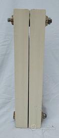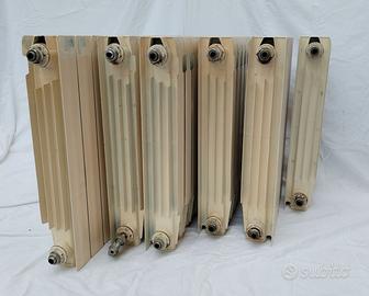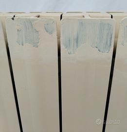 Radiatori in alluminio pressofuso, "FONDITAL", un noto marchio italiano produttore di radiatori in alluminio. Sono radiatori ad elementi componibili (ogni colonna verticale è un elemento che può essere unito agli altri tramite nippli). Dimensioni e Configurazione Interasse: 50 cm. Altezza: Dalla foto con il metro, l'altezza complessiva è di circa 60 cm. Profondità: Sembrano avere una profondità standard, intorno ai 9-10 cm. Colore: Il colore è un bianco crema/avorio, tipico delle installazioni degli anni '90 o primi 2000. Verniciatura: In alcuni punti la vernice sembra leggermente graffiata o opacizzata dal tempo, si notano grandi scrostature sulla parte frontale. Attacchi e Valvole: Gli ingressi e le uscite (dove si collegano le valvole e i detentori) mostrano evidenti segni di ossidazione e ruggine superficiale. Questo è normale per radiatori smontati, ma prima di una eventuale reinstallazione andrebbero puliti accuratamente e le guarnizioni/tappi sostituiti. Quantità: 1 batteria da 2 elementi 2 batterie da 6 elementi 2 batterie da 8 elementi 1 batteria da 10 elementi