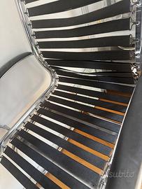 4 sedie modernista con struttura in tubolare di acciaio inossidabile lucidato, braccioli e sedile e schienale ergonomici in doppie cinghie nere. Marcate sulla struttura con il numero "KW 40/01" . La struttura cromata, realizzata in più pezzi di tubolare d'acciaio saldati tra loro, imita il design lineare della sedia Cesca a sbalzo di Breuer, mentre la seduta ergonomica realizzata con diverse cinghie nere, o bungee, trae il suo concetto dalla sedia Sandows di René Herbst. La produzione potrebbe risalire agli anni 1980-1990. Molto confortevole. Prezzo per sedia.