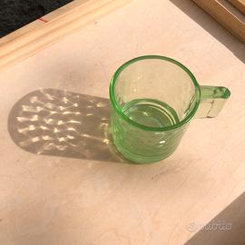 Set composto da 4 bicchierini / tazze originali degli anni ‘60 / ‘70, utilizzati per servire il caffè, prodotti in Germania (?), molto decorativi, da collezione. Materiali e colori: vetro trasparente, spesso, pesante, superficie con texture “organica”, “martellata”, in rilevo nella parte interna (esternamente liscia); colore verde acqua / verde uranio, di tonalità calda (vedi foto di dettaglio scattata all’aperto, in pieno sole) - potrebbe essere un “vetro di uranio” o “vaseline glass", ma NON è stata effettuata la prova di “brillantezza” del verde sotto la luce dei raggi ultravioletti. Dimensioni ingombro max ~ cm.: ø (apertura, esternamente) 5.7 x H 5.9 ø alla base di appoggio 5.2 L con manico 7.5 spessore del vetro 0.3 capacità ~ ml 50 (75 max) Peso totale del set di 4 bicchieri: 480 g Il set si presenta in ottimo stato di conservazione, il vetro è integro; presenti solo minimali segni d’uso (sporcizia e resti di calcare negli interstizi, leggerissimi graffi e/o abrasioni della superficie); potrebbero esserci difetti di produzione quali bolle e/o inclusioni nel vetro - vedi foto. LE FOTO SONO PARTE INTEGRANTE DELLA DESCRIZIONE Nota: potrebbe esserci delle leggere divergenze tra il colore reale e quello che risulta dallo schermo degli apparecchi con i quali viene visualizzata la foto. Non lavabile in lavastoviglie! Il prezzo si riferisce al set di 4 - i bicchieri non sono vendibili singolarmente, il vassoio non è incluso nell’offerta =================== Dai un’occhiata ai miei annunci! Visione e ritiro a mano: Roma 00165 - zona Trastevere