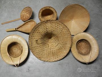 5 vecchi cappelli di paglia asiatici, compreso il tipico copricapo Vietnamita dou lì, 2 utensili da cucina, compreso il famoso Ozgkee lo scolapasta per riso in bambù fatto a mano, in bambù naturale, tutto originale. Consegna a mano.