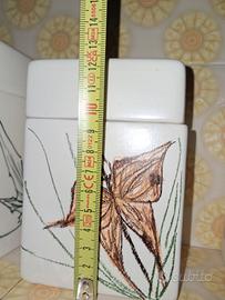 5 ceramiche per arredo cucina, contenitori per zucchero, sale grosso, sale fino, caffw' ecc. Disegni stilizzati adatti a qualsiasi cucina, misure da cm.11a cm.20.Qualche lieve graffiatura come da foto