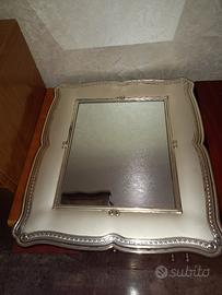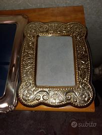 Vendo tutte in blocco a 120 euro non trattabile. 5 cornici in argento. la più grande è con specchio rimovibile e mis. 40 cm x 35 cm.e poi scalare le altre misure. Qualcuna è leggermente annerita ma da lucidare come succede con argento. non hanno ammaccature.