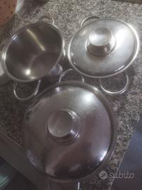 5 Pentole con 5 coperchi marca famosa KOCCHIN Acciaio inox 18/10 Lucido e manici satinati inox saldati,si lavastoviglie. totalmente indistruttibile.acciaio Spesso di alta qualità Triplo Fondo in RAME per piano cottura Gas o elettrico. NO induzione x induzione serve una placca tonda in commercio a 10eu. A mano a Bologna grazie trattabile.