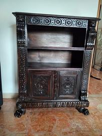 5 pezzi in stile rinascimentale a zampa di leone (fine ‘800), con trattamento antitarlo effettuato da poco, in buono stato composto da: libreria a tre ante in ferro battuto con chiusura a chiave e 2 ripiani interni; mobiletto con ripiani e due ante; cappelliera; cassapanca e sgabellino.