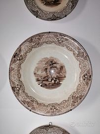 5 antichi piatti, di cui uno grande (centrotavola) da appendere a parete, in perfette condizioni. Decorazioni marroni in campo bianco