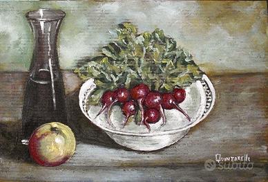 Da collezione privata 5 dipinti olio su tavola, di cui il primo di cm. 30x40 (ciliegie) vendo a euro 100, gli altri 2 di cm. 30x40 (brocca e formaggio, arance e fiasco vino) di cm. 30x40 vendo a euro 80 cad. + ultimi 2 ( rapanelli e gorgonzola) di cm. 24x30 vendo a euro 50 cadauno. Spedizione compresa a mio carico. NO spedizione con Tutto subito. (Non so come si usa).