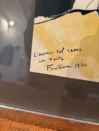 • Serie di 3 quadri intitolata “L’uomo col sacco in testa – Fontana 1976”, grafica artistica su carta in stile anni ’70.