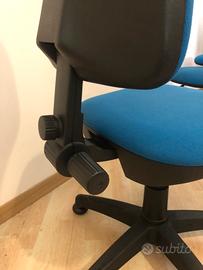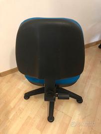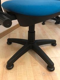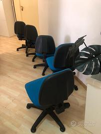 Vendo 5 sedie da ufficio di alta qualità, robuste e in ottime condizioni, usate pochissimo per inutilizzo. La seduta è in tessuto blu e sono complete di ruote e schienale regolabile, ideali per un uso quotidiano e prolungato.