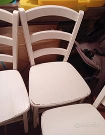 Set di 5 sedie in legno dal delizioso stile shabby chic. Sono in buone condizioni, perfette per arredare la vostra cucina o sala da pranzo. - Le sedie presentano un aspetto vissuto, con qualche segno del tempo che ne aumenta il fascino. - Ideali per chi ama lo stile rustico ed elegante. - Perfette per una cucina o sala da pranzo.20 euro l'una 10 euro quella con la seduta leggermente rovinata ma utilizzabile con un cuscino