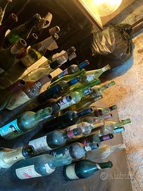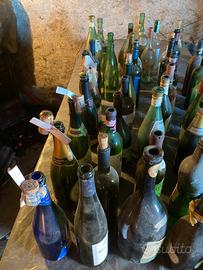 Varie bottiglie vuote e molto vecchie, la maggior parte con etichetta, di vino, spumante e fiaschi, eventualmente da spolverare e/o lavare.