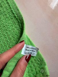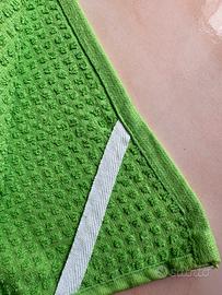 Vendesi stock di asciugamani professionali color verde prato, ideali per parrucchieri, barbieri, centri estetici. Caratteristiche del prodotto: • Qualità professionale: Tessuto con trama a nido d’ape/spugna leggera, progettato per un’asciugatura rapida e un'ottima assorbenza. • Materiale: 100% Cotone (Cotone indiano di alta qualità). • Dimensioni: circa 80 cm x 50 cm (misura standard da salone). • Dettagli: Dotati di pratica asola bianca rinforzata per essere appesi facilmente. • Stato: Nuovi, mai usati (disponibili ancora sigillati, come da foto). Vantaggi: • Resistenti ai lavaggi frequenti (fino a 40°C come da etichetta). • Colore vivace e moderno che dona un tocco di energia all'ambiente. • Ottimo rapporto qualità-prezzo per rinnovo attrezzatura o nuova apertura.