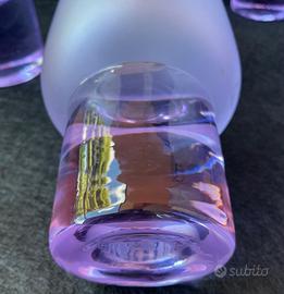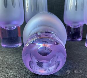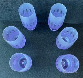 6 bicchiere in cristallo e Alessandrite ( su subito ho anche altri pezzi in Alessandrite) anni 70 con molature sulla circonferenza del bicchiere. L’Alessandrite è un minerale molto raro da trovare in questo periodo, ma negli anni 60/70 dove è la produzione era maggiore venne usato per utilizzarlo nell’ industria del vetro, mischiandolo col vetro donava agli oggetti colorazioni cangianti dal viola al blu e rosa, specialmente mettendolo sotto una fonte di luce al neon vedi seconda foto diventa azzurro….rioeto adesso l’alessandrite è un minerale d’oro e costoso, molte vetrerie Italiane tipo la Arnolfo di Cambio fecero delle serie di bicchieri disegnati Sergio D’Asti e ottennero molto successo negli anni 69/70 adesso sono molto quotati….i bicchieri si presentano bene senza scheggiature o rotture, pesano 2.1 kg. Totale sono alti 16,5 cm. Diametro alla bevuta 5,5 cm. Spedizione a carico vostro ritiro a mano a Parabiago