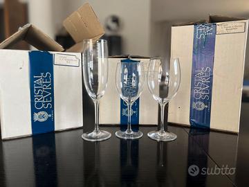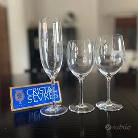 set di 6 calici in cristallo di alta qualità della prestigiosa manifattura francese Cristal de Sèvres. I calici, modello Beaujolais, sono in condizioni eccellenti, forniti con la loro scatola originale 6 acqua 6 vino e 6 Flûte Spumante per un totale di 18pz . Sono stati realizzati artigianalmente e la loro manifattura risale probabilmente agli anni '80. Totali 18 pz