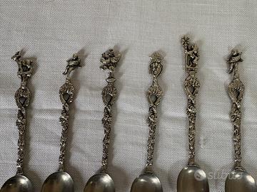 Set di 6 cucchiaini vintage anni 30 da collezione. Ogni cucchiaino è un pezzo unico, caratterizzato da un manico riccamente decorato con lavorazione a sbalzo. In cima a ogni pezzo svetta una figura diversa tra cui si riconoscono due putti, un capricorno, un giullare e simboli araldici. Marchiati italy su retro.