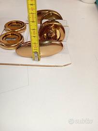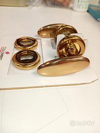 Vendo 6 maniglie dorate Hoppe per porte interne, complete di disco per chiave serratura e ferramenta per l'installazione. Ottime condizioni, usate e ben tenute, made in Italy. Scatola generica, usata per non rovinare le maniglie. Prezzo per il lotto di 6 serrature. Spedizione con corriere GLS
