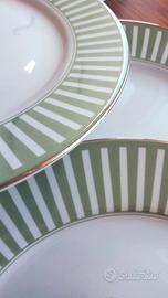 6 stupendi piatti da frutta in porcellana Harmony. Decorazione attualissima con millerighe verde e profilo in oro sul bordo del piatto.