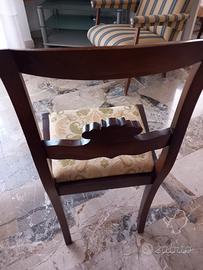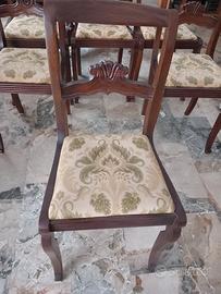 6 sedie in legno con schienale intagliato e seduta con leggera imbottitura.