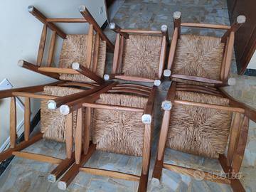 N° 6 sedie in legno impagliate, molto stabili e comode, misure cm. 42 x 40 x 95. Impagliatura buona e ben salda, soltanto una presenta una piccola parte logorata ma la seduta non ne risente. Vendo anche singolarmente a 20 €, 35 € per la coppia, 65 € per 4 pezzi.