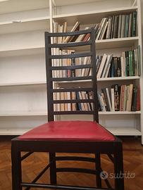 6 Sedie Mackintosh vintage con struttura in legno di frassino nero, schienale alto a pioli, seduta in ecopelle rossa. Prodotte da Alivar nel 1980, con design di Mackintosh 1903. Altezza seduta 44cm. Altezza, larghezza, profondità: 104 cm, 39 cm, 46 cm