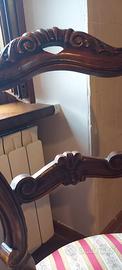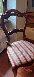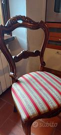 Vendo 6 sedie in legno massello in stile classico Luigi Filippo, con schienale sagomato e seduta imbottita in tessuto damascato a righe.