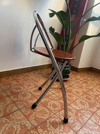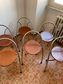 Vendo set composto da 6 sedie da pranzo (altezza seduta 45cm) vintage anni 70 con supporo in acciao (da lucidare) e seduta in legno (da riverniciare). Ottime codnizini, solo qualche piedino sa sostituire. Ritiro a Roma zona Testaccio, no spedizione.