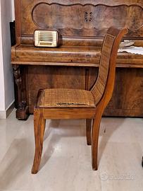 Seggiole di legno asiatico, di vimini lo schienale e la seduta, che è imbottita.