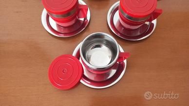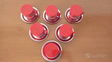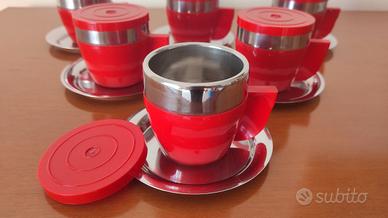 6 tazzine caffè con piattino e coperchio in plastica rossa e acciaio, vintage anni 70 della inoxriv made in Italy Mai usate, da collezione