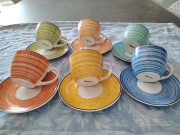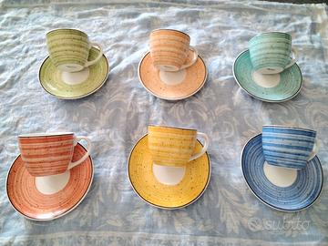 6 tazzine da caffè e 6 piattini di marca Tognana serie Iris Caleido, in porcellana multicolor adatta al microonde e alla lavastoviglie.