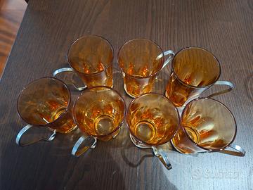 Set di splendidi bicchieri da caffè, the o liquore in vetro ambrato pressato con manico metallico, originali anni '50. Da collezione o per intenditori, dimensioni 8.5 cm di altezza e 5.5 di diametro superiore. Probabilmente di fabbricante francese, con ma ereditati senza adesivi originali, hanno solo i tipici numeri impressi sul fondo. Bellissimi, per intenditori!