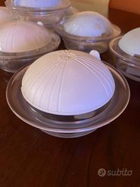 Lotto di 7 formaggiere in plexiglas, 3 con il coperchio bianco e 4 celeste polvere. Utilizzabili anche come zuccheriere o per servire salse o marmellate. Nuove confezionate