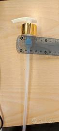 7 Pompette dispenser color oro lilla nero, con lunghezza tubo tra i 30 e i 32cm, anche vendibili singolarmente. Diametro inboccatura da 3cm. Condizioni: Nuove mai usate.