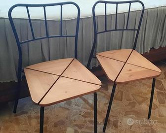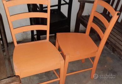 7 sedie da cucina, di cui 4 completamente in legno (2 arancioni e 2 nere), 2 in legno e metallo, 1 in resina e paglia. Tutte in ottimo stato, le ultime 3 praticamente nuove.