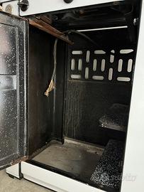 Rara cucina a gas anni ’60 con tre fuochi, funzionante a bombola, completa di coperchio richiudibile in metallo smaltato. Design classico con manopole e maniglia cromata originali.