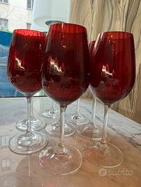 8 bicchieri con stello adatti sia per acqua che per vino. Base trasparente, coppa rosso rubino. Perfetti per tavola delle feste Natale e/o capodanno. Perfette condizioni.