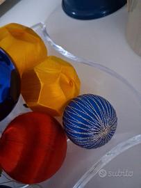 perfette condizioni 8 palline di Natale in vetro colorato, tessuto satin e filo di seta di varie dimensioni vintage