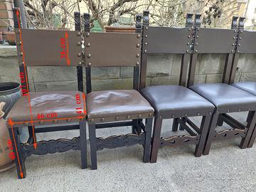 8 sedie stile rustico/rinascimentale, 6 grandi e 2 piccole, nelle foto di gruppo sono quelle che hanno un colore più chiaro. Il prezzo è 50 euro cadauna.