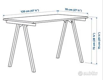 Dimensioni pratiche: 120cm (L) × 70cm (P), altezza utile sotto il piano 73cm, altezza totale 75cm
