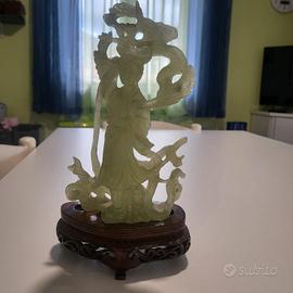 scultura ornamentale in pietra dura tipo serpentino/jadeite, di colore verde chiaro semitrasparente, finemente traforata, raffigurante una figura mitologica/immortale cinese avvolta da chimere o draghi, su base lignea intagliata (tipica produzione cinese).