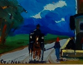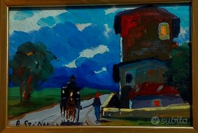 Alfredo Stengher (Livorno, 1920–2000) "Notturno con carrozza" olio su tavoletta 10x15 con cornice 29x25.. E' stato un pittore autodidatta toscano, noto per il suo stile post-macchiaiolo e impressionista. Prediligeva paesaggi toscani, marine e figure, caratterizzati da una stesura rapida, corsiva e un forte senso del colore, spesso lavorando su tavola (faesite/masonite) con grande immediatezza lirica. Artsper +2 Ecco i punti chiave su Alfredo Stengher: • Stile e Tecnica: Autodidatta, influenzato dalla scuola dei Macchiaioli e dagli impressionisti, Stengher è noto per la sua pittura immediata, definita "corsiva", che cattura vibrazioni di luce con pochi tocchi di colore. • Temi: La sua produzione si concentra sul paesaggio toscano, scene di vita, marine e ritratti, con una visione naturalistica e lirica. • Supporti: Molte delle sue opere, specialmente negli anni '60/'70, sono dipinte a olio su pannello di faesite o masonite. • Carriera: Attivo principalmente a Livorno, ha partecipato a diverse mostre personali e collettive, ottenendo buoni riscontri di critica.