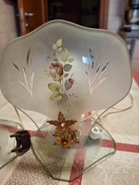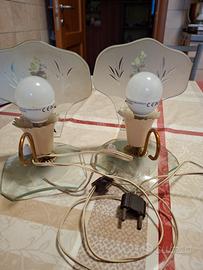 Coppia di abaj jour vintage anni '50 in vetro e ottone. Il paralume è in vetro smerigliato con motivi floreali, invece la base è in vetro trasparente con elementi decorativi in ottone. In ottime condizioni. Tutto originale, compreso il filo elettrico, tranne I pulsanti di accensione nuovi, perché mancanti. Perfettamente funzionante (come da foto). Lampadine non incluse.