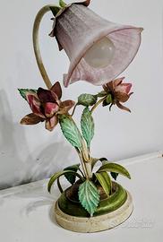 Materiali: La struttura è in metallo (Toleware), dipinta e dorata a mano, e presenta un paralume in vetro rosa a forma di fiore.