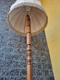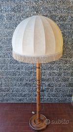 Abat jour vintage con paralume con frange e struttura di legno, alta 1,72 metri.