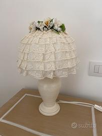 Coppia di abat jour e cornice realizzati artigianalmente da una ricamatrice, in legno e pizzo, con ricami floreali, in perfetto stile shabby romantico. La misura della cornice è 35x50. In ottime condizioni.