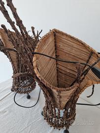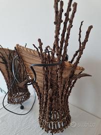 Coppia di lampade da tavolo etniche in rattan intrecciato, stile naturale e artigianale. Rami decorativi e base in ferro battuto, con piedini sferici.