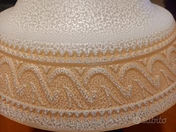 Abat jour o paralume con alla base lavorazione intrecciata in ferro battuto con lume a campata in vetro di Murano satinato il quale, presenta sul lato una decorazione a greca con colori a pastello giallo ocra, munito di 2 lampade piccole formato E14 di cui si possono mettere anche quelle di tipo LED caldo le quali creano un effetto straordinario. Il suo piede d'appoggio è costituito da una base in legno con il supporto, come detto in ferro battuto ad intreccio bombato e verniciato oro antichizzato, altezza circa 45 cm.
