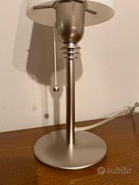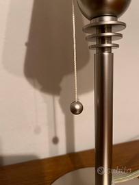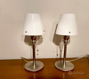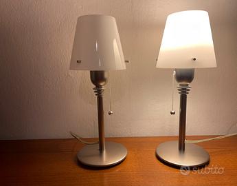 Abat Jour STUDIO design ITALIA art Silart/TA in acciaio inox ,con la parte superiore, le tazze o i capelli come si chiamano in vetro dello spessore di 3 mm. Un’ Abat Jour ha il vetro esternamente lucido, l’altra Abat Jour che è praticamente la stessa identica ha il vetro opaco, cioè non lucido come l’altra ma il colore è lo stesso dell’altra e la differenza non si nota molto. ogni abat-jour pesa 1,7 kg perché deve garantire la stabilità visto che la bellezza di queste abat-jour è che per accenderle bisogna tirare la corda dove all’estremità è collocata una pallina sferica d’acciaio di 9 mm. Gli interruttori di queste lampade design sono molto resistenti e precisi. Le lampade sono alte ognuna 35 cm, il diametro della base è di 13 cm, lo stesso diametro del cappello in vetro calcolando la base ed essendo conici i vetri nella parte superiore il diametro è di 8,5 cm per un’altezza di 12 cm. Sono lampade molto belle e ben progettate come le potete vedere in foto sotto il portalampade sempre in acciaio c’è un disegno che compone tre anelli concentrici, cioè sovrapposti uno all’altro da una distanza di 7 mm che conferiscono alle stesse lampade un aspetto gradevole e particolare. Queste lampade possono essere collocate sui comodini di una camera da letto o utilizzate anche come lampade da tavolo, visto che sono alte 35 cm e sono veramente molto belle. Le lampade posseggono un cavo elettrico trasparente. La lunghezza del filo di una lampada è di 60 cm ed è comunque facilmente collegabile a una spina visto che sul comodino sono molto vicine, l’altra lampada ha il filo più lungo ed è di 100 cm con spine bianche in ottime condizioni.