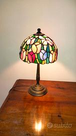 Lampada in ottone brunito e vetro colorato. Altezza 40 cm