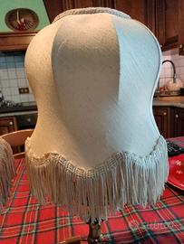Elegante coppia di abat jour in ottone lavorato, paralume in tessuto beige con frange.
