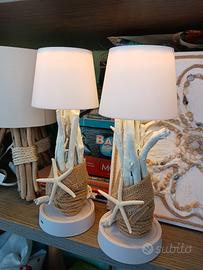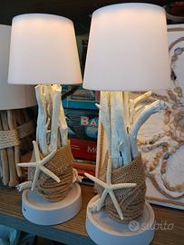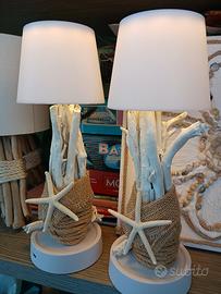 coppia di abatjour con legni di mare e stelle marine. luce LED. dotate di cavetto usb per ricarica